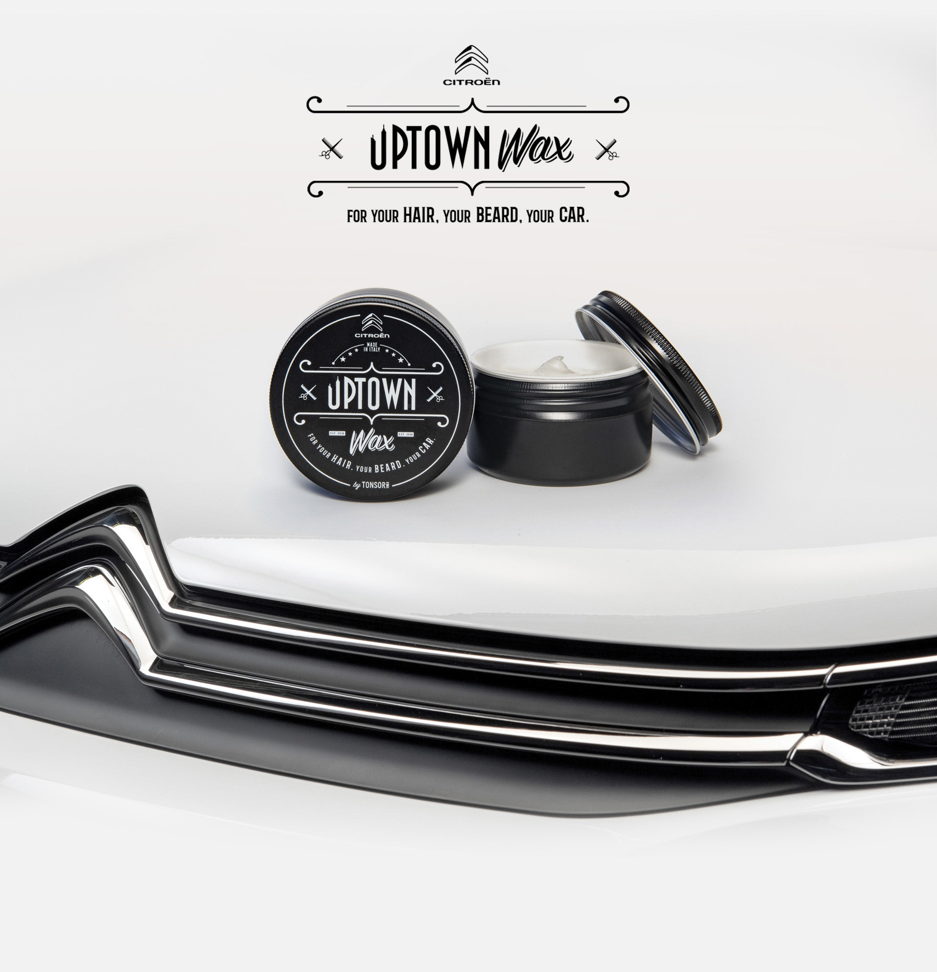 Citroën crea Uptown Wax. La prima cera per capelli, barba e auto. Una cera multiuso in grado di modellare barba e capelli e allo stesso tempo far risplendere la carrozzeria di una automobile. Uptown Wax è stata lanciata con una campagna integrata sui touch point più rivelanti per il target: su Instagram, nei canali social di influencer e trend setter del settore beauty/style e al Fuorisalone di Milano.